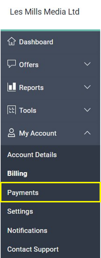 You have the ability to access TUNE Pay via your LES MILLS+ Partner Portal. To access TUNE Pay, navigate to the My Account section and click Payments. TUNE Pay will then open in a new web browser tab. There are two menu items to interact with, Your Profile and Payments.