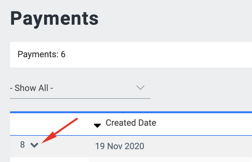 To see which invoices are associated with which payments, partners can click the down arrow next to the Payment ID.